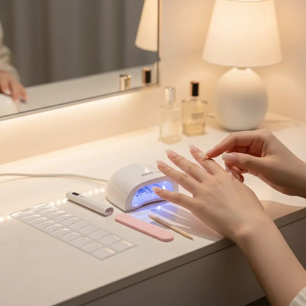 Une fois tous les strips posés, placez vos ongles sous la lampe UV compacte incluse. Laissez durcir le gel pendant quelques secondes (environ 60s) pour un fini ultra-brillant et durable. Admirez votre manucure salon, faite maison, qui tiendra des semaines !